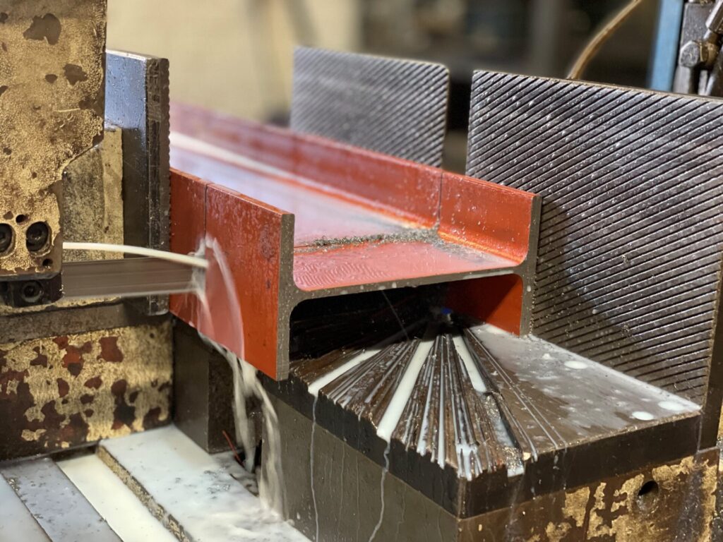 A variety of methods are used for cutting, dependant on the material and quantity.  Steel beams are general cut using a horizontal bandsaw.  This gives a clean accurate cut while keeping the beams cool to ensure minimum distortion with high precision.