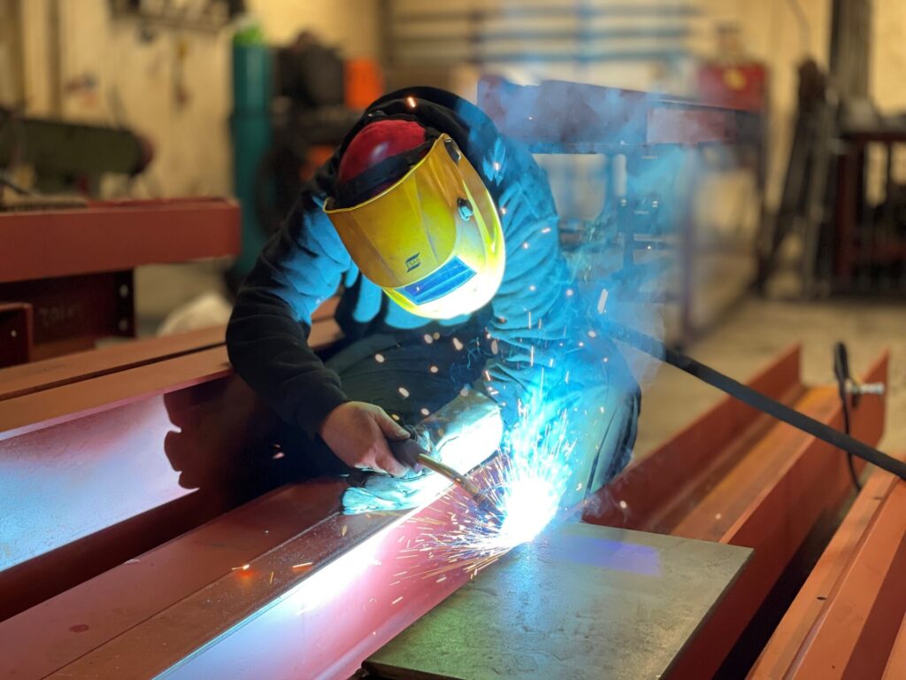 All welding is done in house.  Welders are coded, qualified and trained to following strict welding procedures.  This allows us to ensure the quality and standard of weld required to comply with BS EN 1090 (UK CA marking).