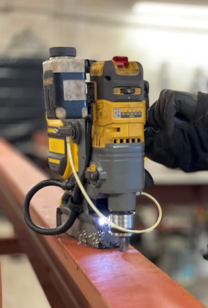 A wide variety of Magnetic base drills are used for the drilling of holes.  From large heavy machines to drill larger holes through to smaller compact machines for ease of drilling in tighter spaces.  we even use the latest 54volt Battery mag base drills manufactured by DeWalt.