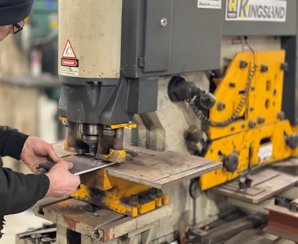 Flat bar, angle and round sections are sheared or cropped using a Kingslands work centre.  This assists with speed of fabrication as drilling and sawing can be a slower process.